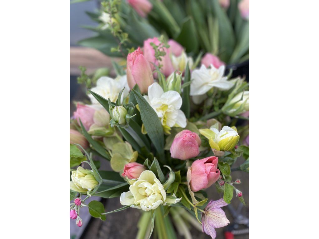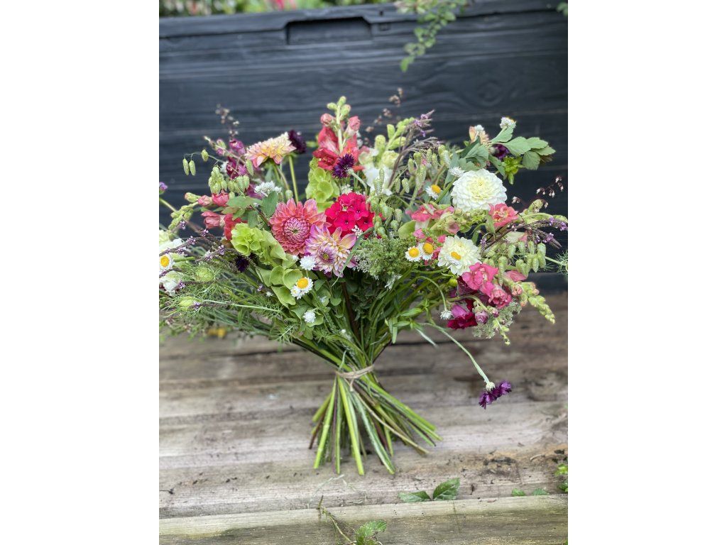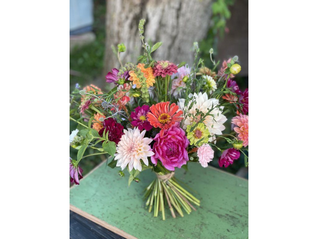 Kytice z čerstvých lokálních květin, ručně vázaná s ohledem na sezónnost a přírodní pestrost. Darujte autentický kousek přírody.